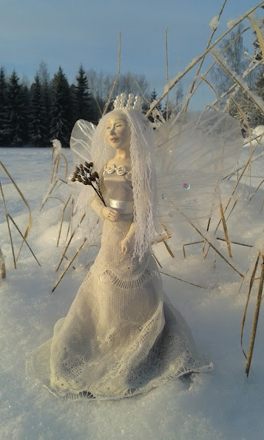 | Sinihiuksinen talven haltiatar. Muokkasin viime vuoden keijufiguuristani siivettömän huntupäisen haltian. |